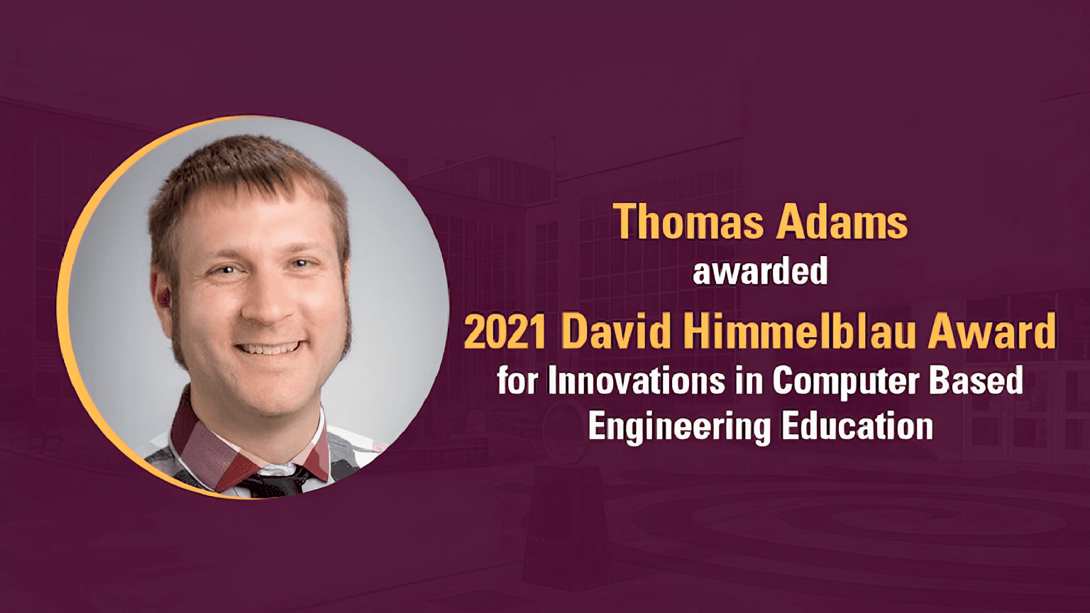 Thomas Adams, Associate Professor and Associate Chair, Graduate with the department of chemical engineering, has been awarded the 2021 David Himmelblau Award for Innovations in Computer Based Engineering Education.