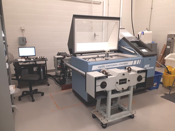 CAMC has two Ascott Analytical salt spray chambers, one 400L volume, and the other 1000L volume. These chambers can run standard salt spray tests like ASTM B117 or SAE J2334, as well as custom cycles combining heating, cooling, humid, dry, and spray steps.