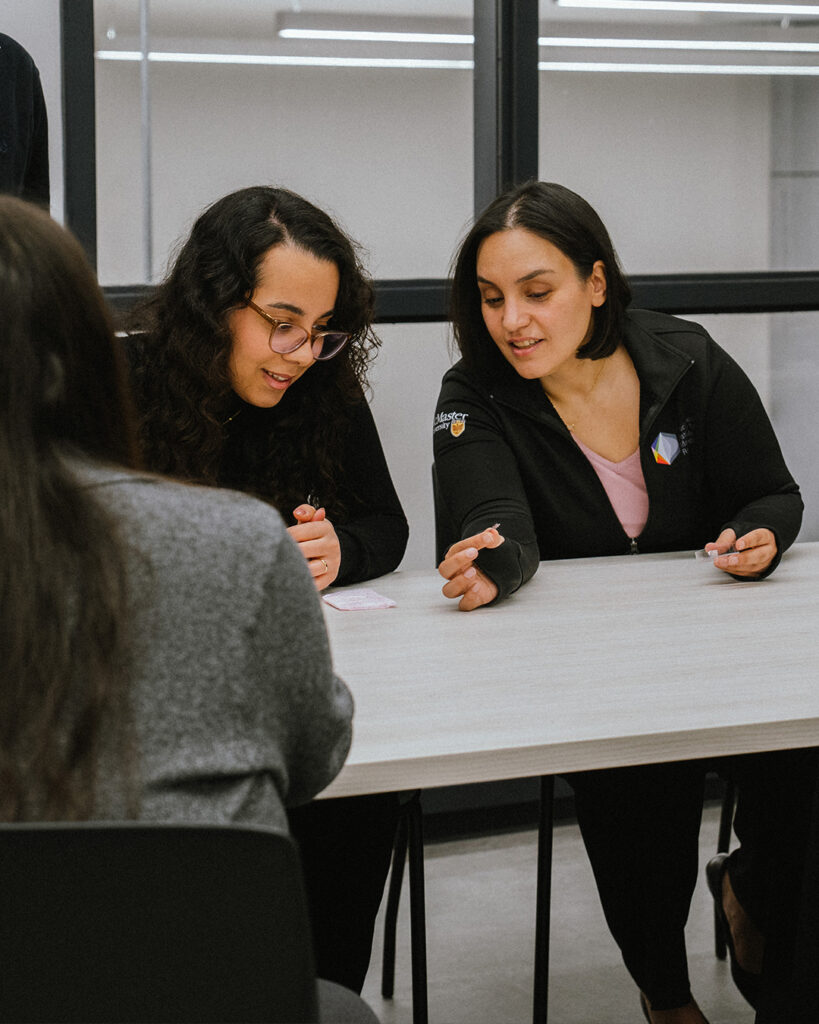 Zoe talks to the members of the capstone group at a table, a few of them have their hands under their chins focused on taking what Zoe is sharing in